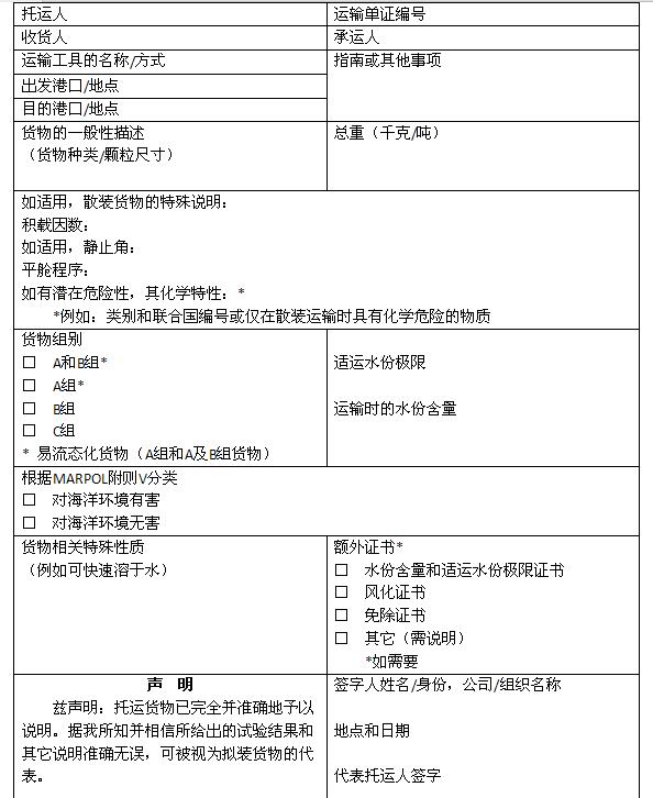 船方應(yīng)當(dāng)要求托運(yùn)人對(duì)其托運(yùn)的貨物是否對(duì)海洋環(huán)境有害進(jìn)行申明(申明格式見(jiàn)附件2),并將申明隨船保存至少兩年。