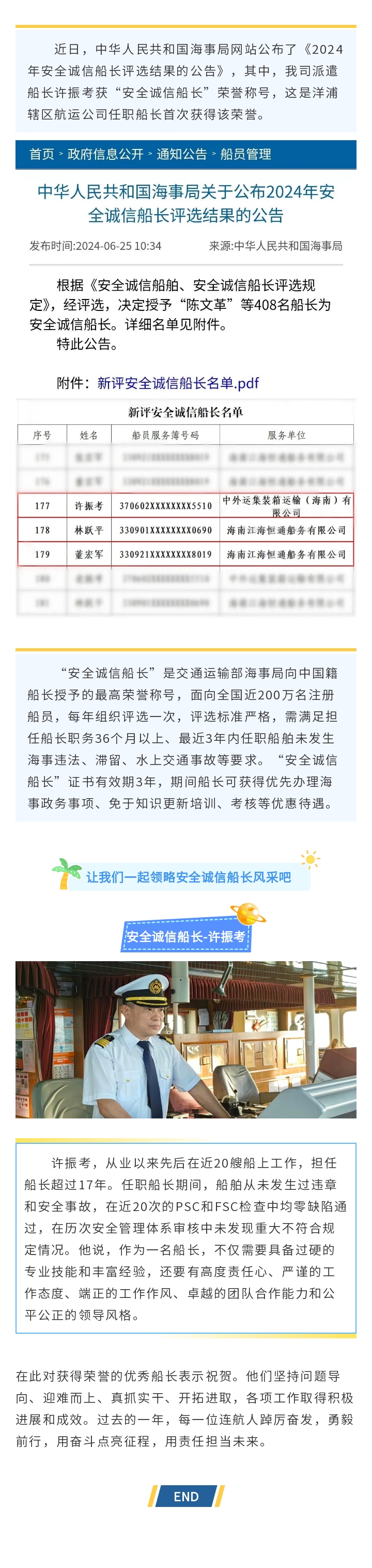 喜報(bào)!青島連航派遣船長(zhǎng)榮獲全國(guó)“安全誠(chéng)信船長(zhǎng)”稱號(hào)
